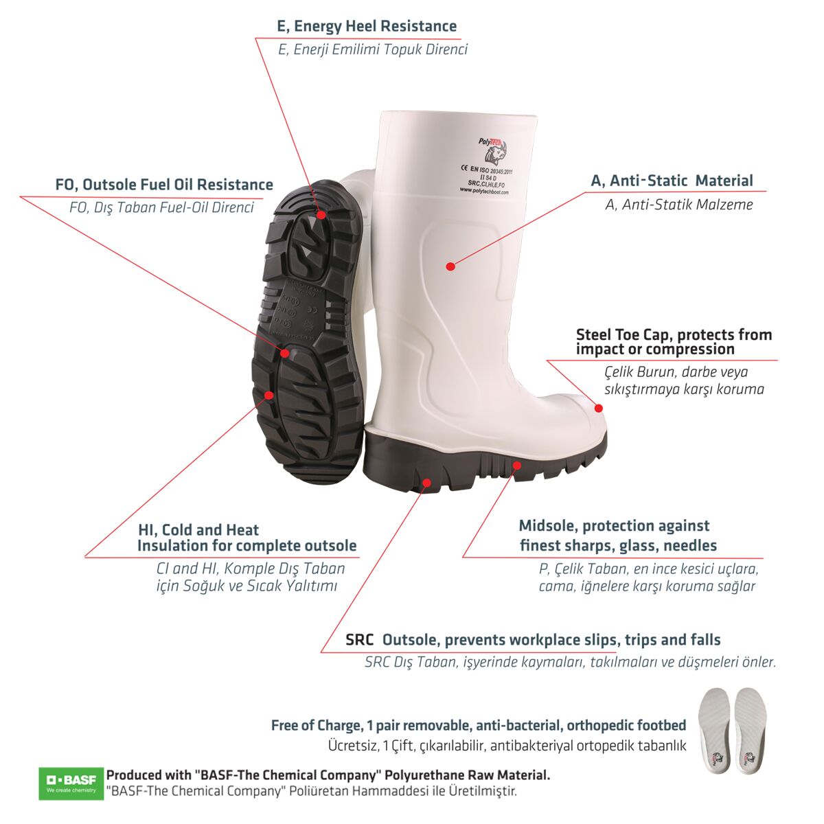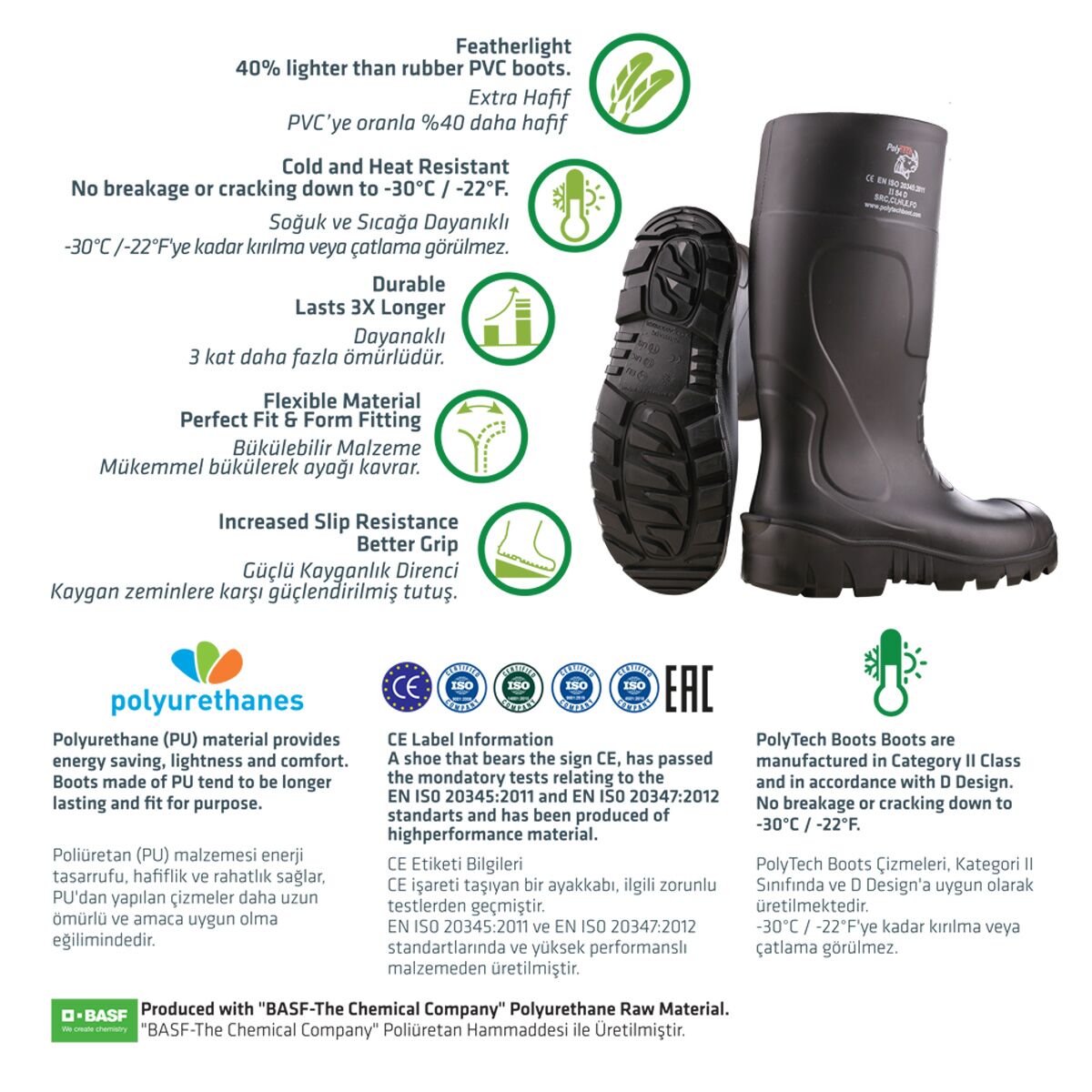 Avrupa Birliği CE, ISO ve Rus EAC standartlarında sertifikalı üretilen PolyTech Boot Poliüretan çizmeleri